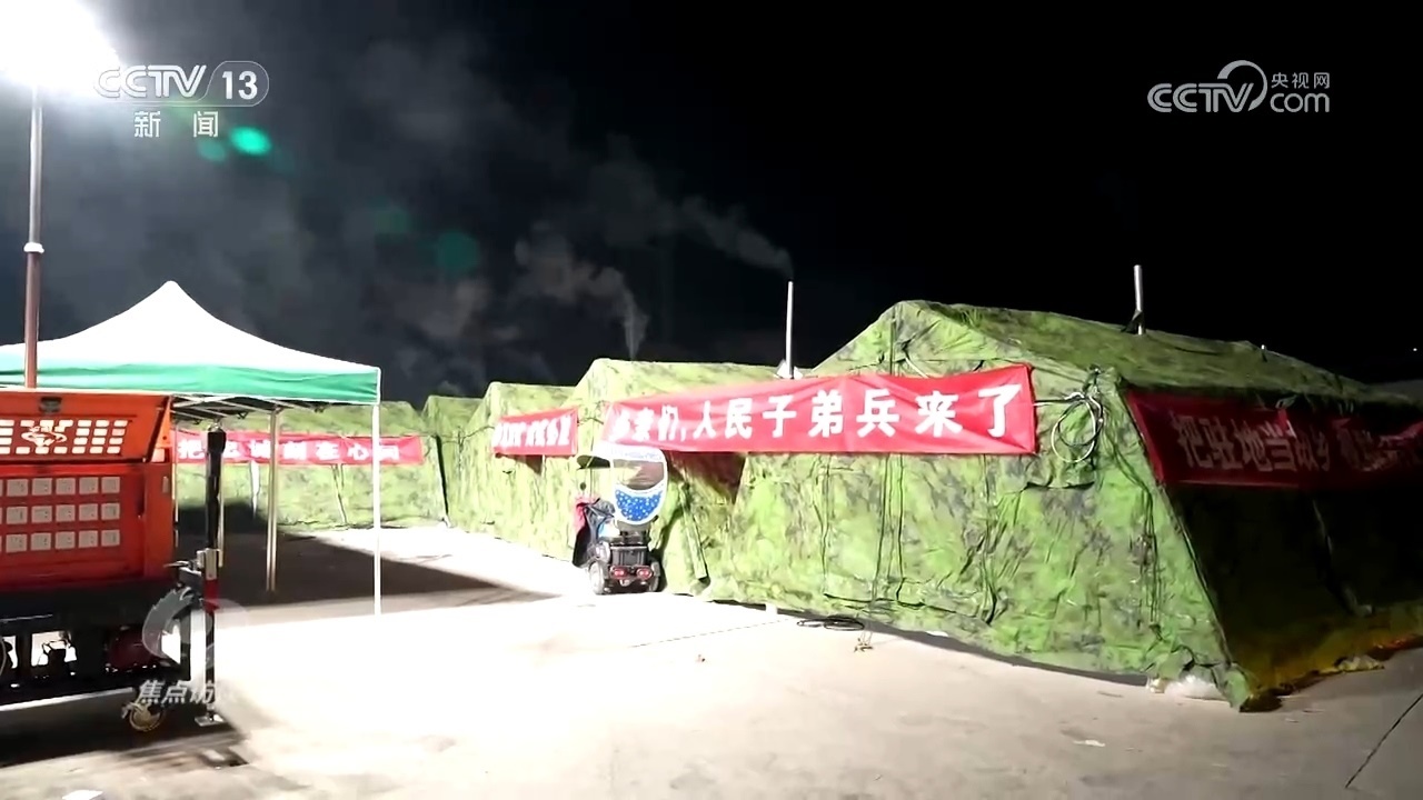 凌晨4時(shí),室外的溫度達(dá)到了零下13℃左右,安置點(diǎn)的每一頂帳篷里面都有一個(gè)取暖爐,取暖爐可以保證室內(nèi)的溫度,保證受災(zāi)群眾基本取暖需求。水果、飲料、榨菜、泡面這些基本應(yīng)急物資都有提供,還有一臺炊事車,部隊(duì)的炊事車可以提供熱食,像做米飯、饅頭,包括一些炒菜、湯都可以實(shí)現(xiàn),可以滿足受災(zāi)群眾的一日三餐,滿足他們的基本用餐需求。