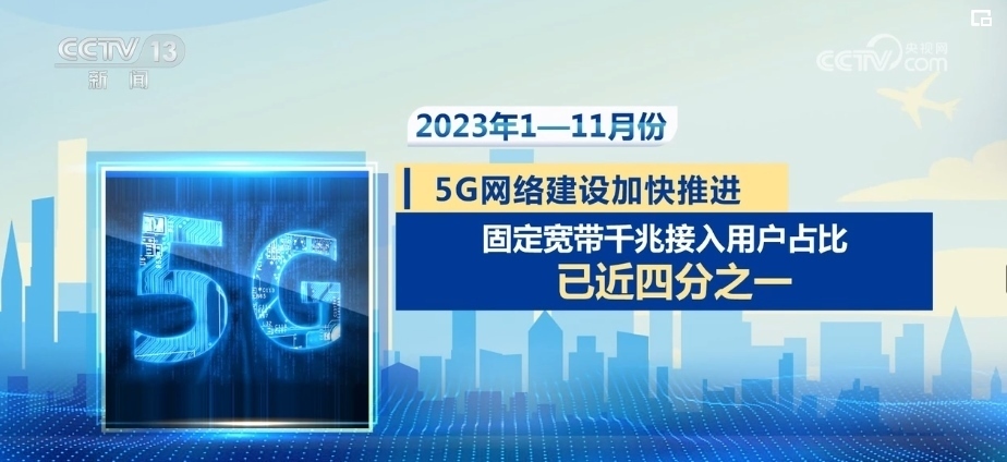 2023年1—11月份,5G網(wǎng)絡(luò)建設(shè)加快推進(jìn),固定寬帶千兆接入用戶占比已近四分之一。截至11月末,5G基站總數(shù)達(dá)328.2萬個(gè),占移動(dòng)基站總數(shù)的28.5%。5G移動(dòng)電話用戶達(dá)7.71億戶,占移動(dòng)電話用戶的44.7%。千兆及以上接入速率的固定互聯(lián)網(wǎng)寬帶接入用戶達(dá)1.57億戶,占總用戶數(shù)的24.6%。