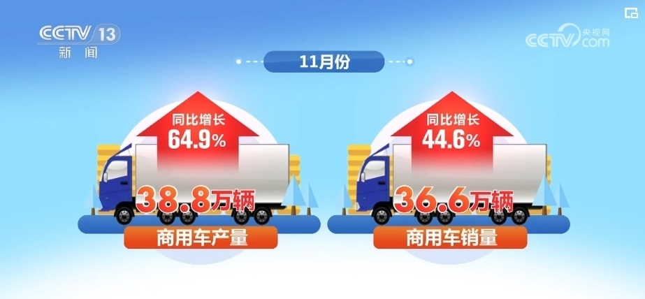 數(shù)據(jù)顯示,11月份,商用車產(chǎn)銷量分別完成38.8萬輛和36.6萬輛,同比分別增長(zhǎng)64.9%和44.6%。在商用車主要品種中,與上年同期相比,客車、貨車產(chǎn)銷均呈兩位數(shù)增長(zhǎng)。
