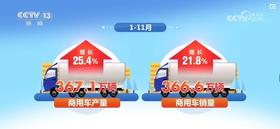 在1—11月份的數(shù)據(jù)中,商用車產(chǎn)銷量分別完成367.1萬輛和366.6萬輛,同比也實(shí)現(xiàn)了兩位數(shù)增長(zhǎng),分別增長(zhǎng)25.4%和21.8%。