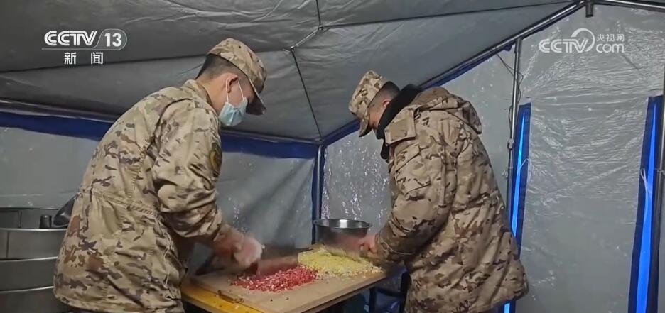 在青海民和中川鄉(xiāng)草灘村美一小學安置點,官兵們準備食材和面剁餡,他們要在這個特殊的日子,讓受災群眾吃上一碗熱騰騰的餃子。帳篷里,群眾和官兵分工協(xié)作,處處洋溢著“家”的溫馨。