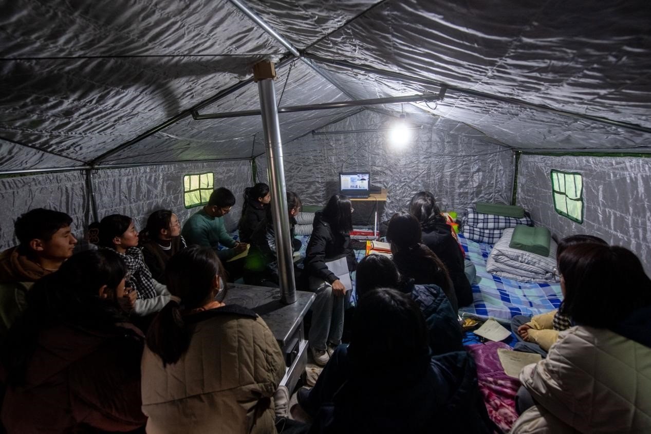 12月22日,在積石山縣大河家鎮(zhèn)大河村安置點,部分高中學(xué)生在帳篷中聽課。人民網(wǎng)記者 翁奇羽攝
