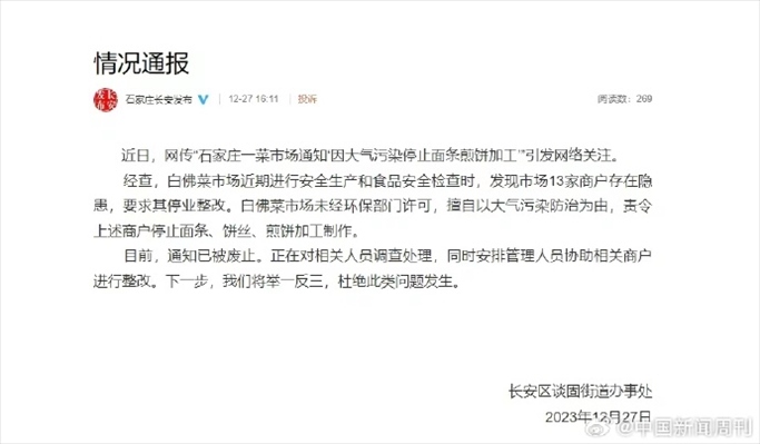 ·石家莊一菜市場(chǎng)通知“因大氣污染停止面條煎餅加工”?官方回應(yīng)。