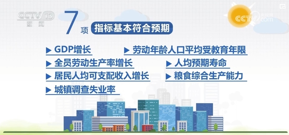 7項指標基本符合預期,分別是GDP增長、全員勞動生產率增長、居民人均可支配收入增長、城鎮(zhèn)調查失業(yè)率、勞動年齡人口平均受教育年限、人均預期壽命、糧食綜合生產能力。
