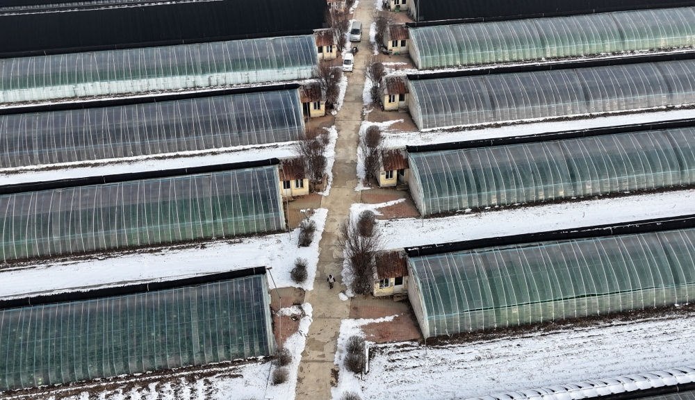 在天津市西青區(qū)辛口鎮(zhèn)水高莊村拍攝的修繕后的大棚一景(12月12日攝,無(wú)人機(jī)照片)。新華社記者 李然 攝