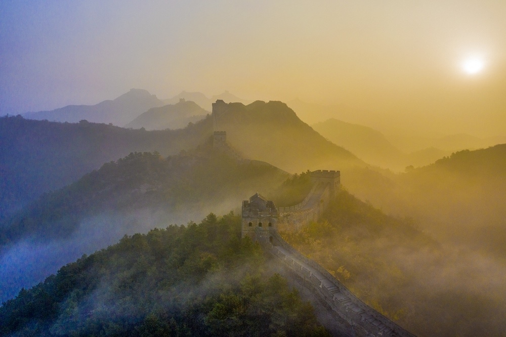 這是2023年11月1日拍攝的河北承德金山嶺長城日出景觀(無人機照片)。新華社發(fā)(周萬平 攝)