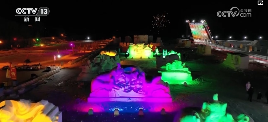 夜幕降臨,富錦市冰雪樂(lè)園一片流光溢彩,40余座雪雕景觀將童話里的人物搬到了現(xiàn)實(shí)。雪地大滑梯、雪地摩托車等娛樂(lè)項(xiàng)目也吸引了眾多游客前來(lái)游玩。