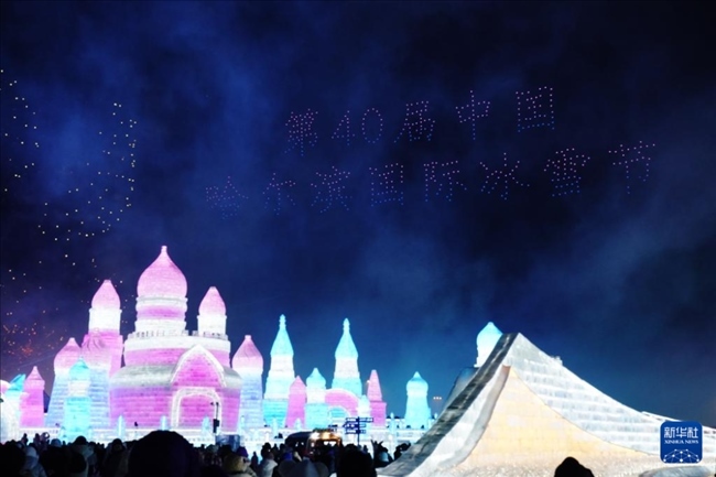 1月5日,在哈爾濱冰雪大世界園區(qū),游客在觀看哈爾濱國(guó)際冰雪節(jié)開幕式上的無(wú)人機(jī)表演。當(dāng)日,第40屆中國(guó)·哈爾濱國(guó)際冰雪節(jié)開幕,吸引眾多游客。新華社記者 王建威 攝