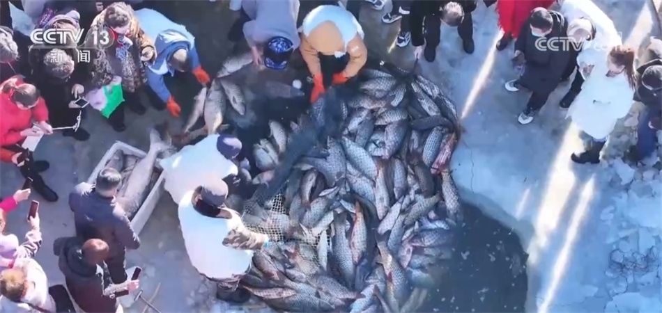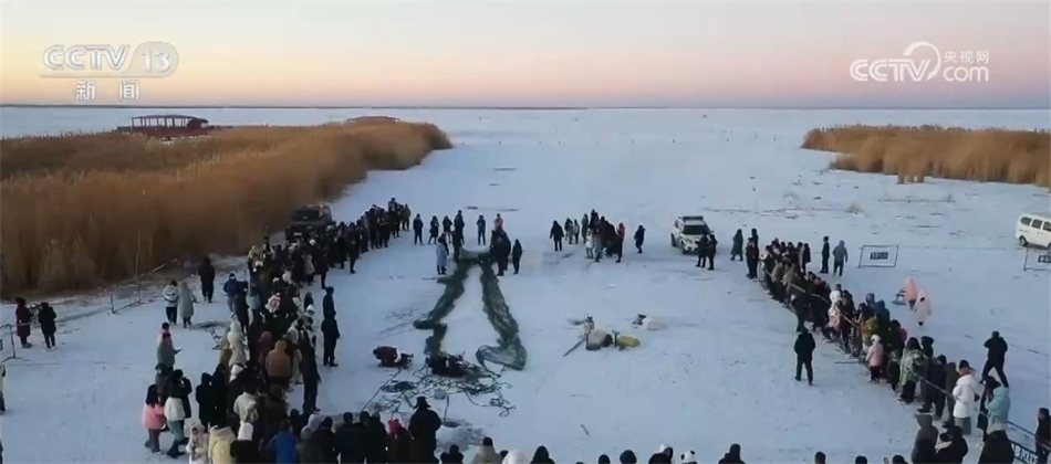 總臺(tái)記者? 阮超:我現(xiàn)在是烏梁素海的冰面上,我身邊就是此次冬捕的出魚口。隨著漁網(wǎng)緩緩拉動(dòng),水面下的魚被不斷運(yùn)送到冰面上來。