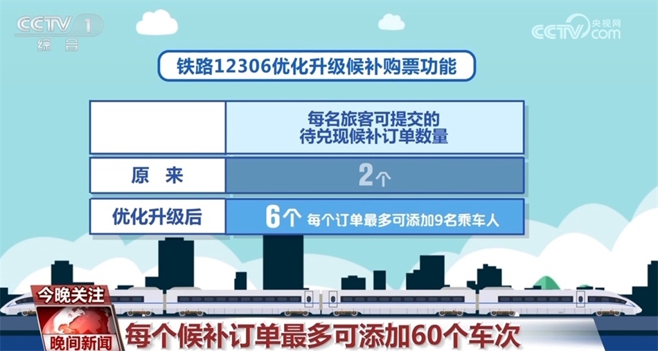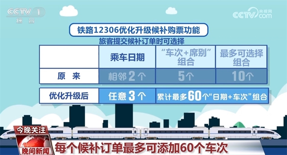 自1月11日零時(shí)起,鐵路12306優(yōu)化升級(jí)候補(bǔ)購(gòu)票功能,來(lái)看一下具體變化:優(yōu)化升級(jí)后,每名旅客可提交的待兌現(xiàn)候補(bǔ)訂單數(shù)量由2個(gè)增至6個(gè),每個(gè)訂單最多可添加9名乘車人;原來(lái)旅客提交候補(bǔ)訂單時(shí),可選擇相鄰2個(gè)乘車日期、每個(gè)日期可選擇5個(gè)“車次+席別”的組合,最多可選擇10個(gè)組合。優(yōu)化升級(jí)后,旅客可選擇預(yù)售期內(nèi)任意3個(gè)乘車日期,累計(jì)最多可選擇60個(gè)“日期+車次”的組合;原來(lái)候補(bǔ)訂單截止兌現(xiàn)時(shí)間最晚為開(kāi)車前2小時(shí),優(yōu)化升級(jí)后調(diào)整為開(kāi)車前20分鐘。