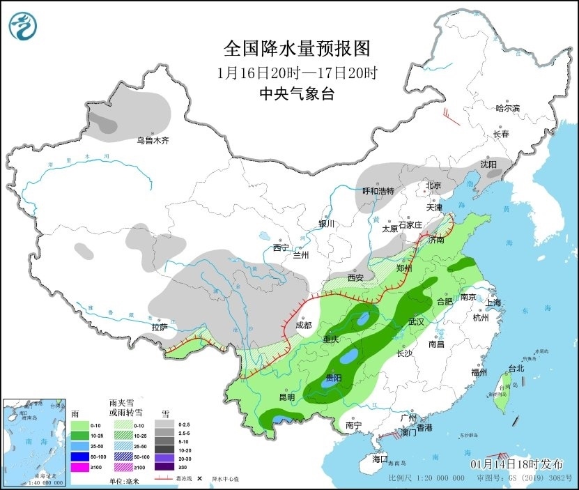 1月16日20時(shí)至17日20時(shí),新疆西部、青海南部、西藏東部、內(nèi)蒙古中部、遼寧中南部、河北北部、川西高原、陜西南部、山西南部、河南西北部、山東西北部、云南西北部等地的部分地區(qū)有小到中雪或雨夾雪;黃淮大部、江淮大部、江漢、江南西部、四川東部、重慶、貴州、云南、廣西西部、臺灣島等地的部分地區(qū)有小到中雨,其中湖北西南部、貴州中部和東北部、云南南部等地的部分地區(qū)有大雨。內(nèi)蒙古東南部等地的部分地區(qū)有4~5級風(fēng)(見圖3)。
