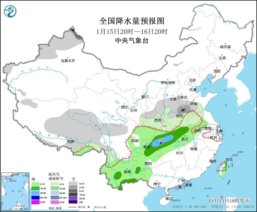 1月14日20時(shí)至15日20時(shí),新疆北疆西北部、西藏東部、甘肅東部、陜西、山西南部、河南等地的部分地區(qū)有小到中雪,其中新疆阿勒泰、陜西南部、河南西部等地的部分地區(qū)有大雪,局地暴雪(10~12毫米),陜西南部、湖北西北部局地有凍雨;西南地區(qū)東部、江漢中西部、江南西部和東北部、廣西西部和北部、云南南部、海南島等地有小到中雨,其中重慶中北部等地局地有大雨(25~35毫米)。山東半島、江南東北部、西藏等地的部分地區(qū)有4~6級風(fēng),其中浙江東部沿海、西藏中部的部分地區(qū)風(fēng)力可達(dá)7級以上(見圖1);臺灣海峽有7~8級、陣風(fēng)9級的東北風(fēng),黃海、東海大部、南海中北部和西南部有5~7級風(fēng),陣風(fēng)8級。