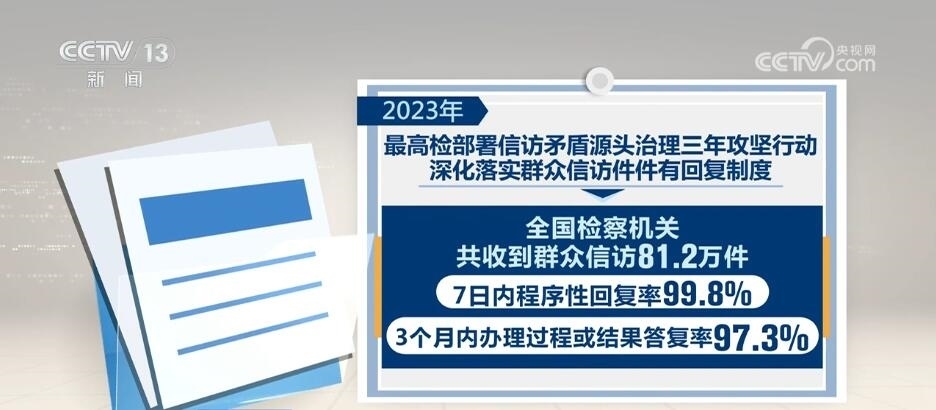 2023年,最高檢部署信訪矛盾源頭治理三年攻堅行動,深化落實群眾信訪件件有回復制度。全國檢察機關(guān)共收到群眾信訪81.2萬件,7日內(nèi)程序性回復率99.8%,3個月內(nèi)辦理過程或結(jié)果答復率97.3%。