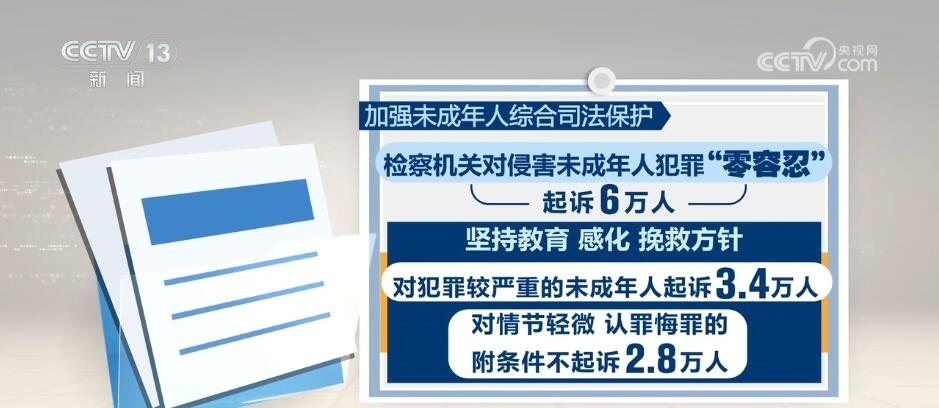 加強未成年人綜合司法保護。檢察機關(guān)對侵害未成年人犯罪“零容忍”,起訴6萬人。堅持教育、感化、挽救方針,對犯罪較嚴重的未成年人起訴3.4萬人;對情節(jié)輕微、認罪悔罪的,附條件不起訴2.8萬人。部署加強犯罪預防工作,推動罪錯未成年人分級干預,協(xié)調(diào)推動專門學校建設(shè),依法矯治有嚴重不良行為的未成年人。