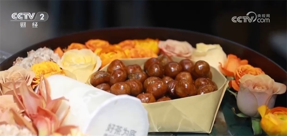 一些商家也是緊跟潮流,順勢(shì)推出“入冬四件套”禮盒。這家花店把鮮花、奶茶、糖葫蘆、糖炒栗子組合起來售賣,受到許多消費(fèi)者的歡迎。?
