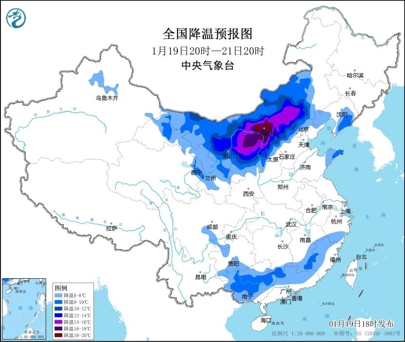預(yù)計(jì),1月19日20時(shí)至1月21日20時(shí),西北地區(qū)東部、內(nèi)蒙古中西部、華北北部、華南等地的部分地區(qū)將降溫8~12℃,其中,內(nèi)蒙古河套地區(qū)和中部、陜西北部、山西北部、河北西北部等地部分地區(qū)降溫可達(dá)14~16℃,局地可超過(guò)18℃。