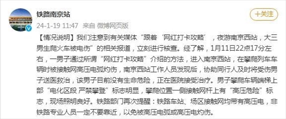 ·南京站回應(yīng)“大學(xué)生爬火車打卡被燒傷進(jìn)ICU”:男子無(wú)生命危險(xiǎn),接觸網(wǎng)均有高壓電非專業(yè)人員不要靠近。