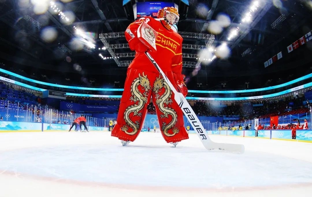 △北京冬奧會(huì)上,女子冰球門(mén)將周嘉鷹穿著中國(guó)龍護(hù)具。