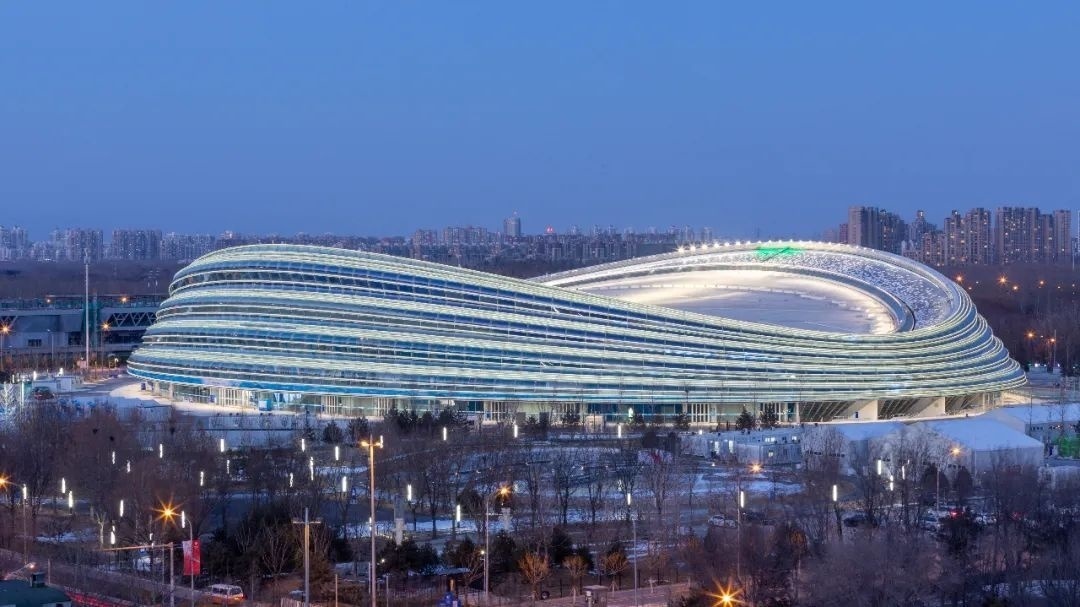 沿北京中軸線一路向北,空中俯瞰,國(guó)家速滑館宛若冰刀在冰面上刻下的晶瑩軌跡。它的另一個(gè)名稱“冰絲帶”,由此得名。