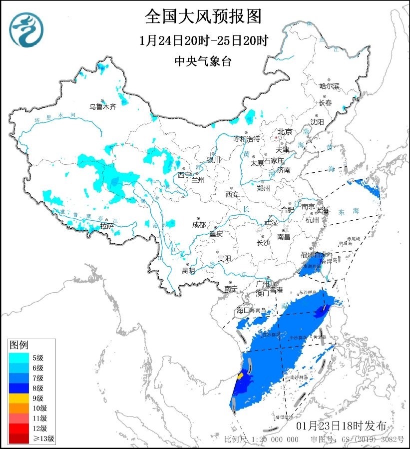 1月24日20時(shí)至25日20時(shí),青海北部和西部、福建沿海等地部分地區(qū)有5~6級、陣風(fēng)7級的大風(fēng);臺灣海峽、巴士海峽、南海大部海域?qū)⒂?~8級、陣風(fēng)9~10級的大風(fēng),其中南海西南部的部分海域風(fēng)力可達(dá)9級、陣風(fēng)10級。