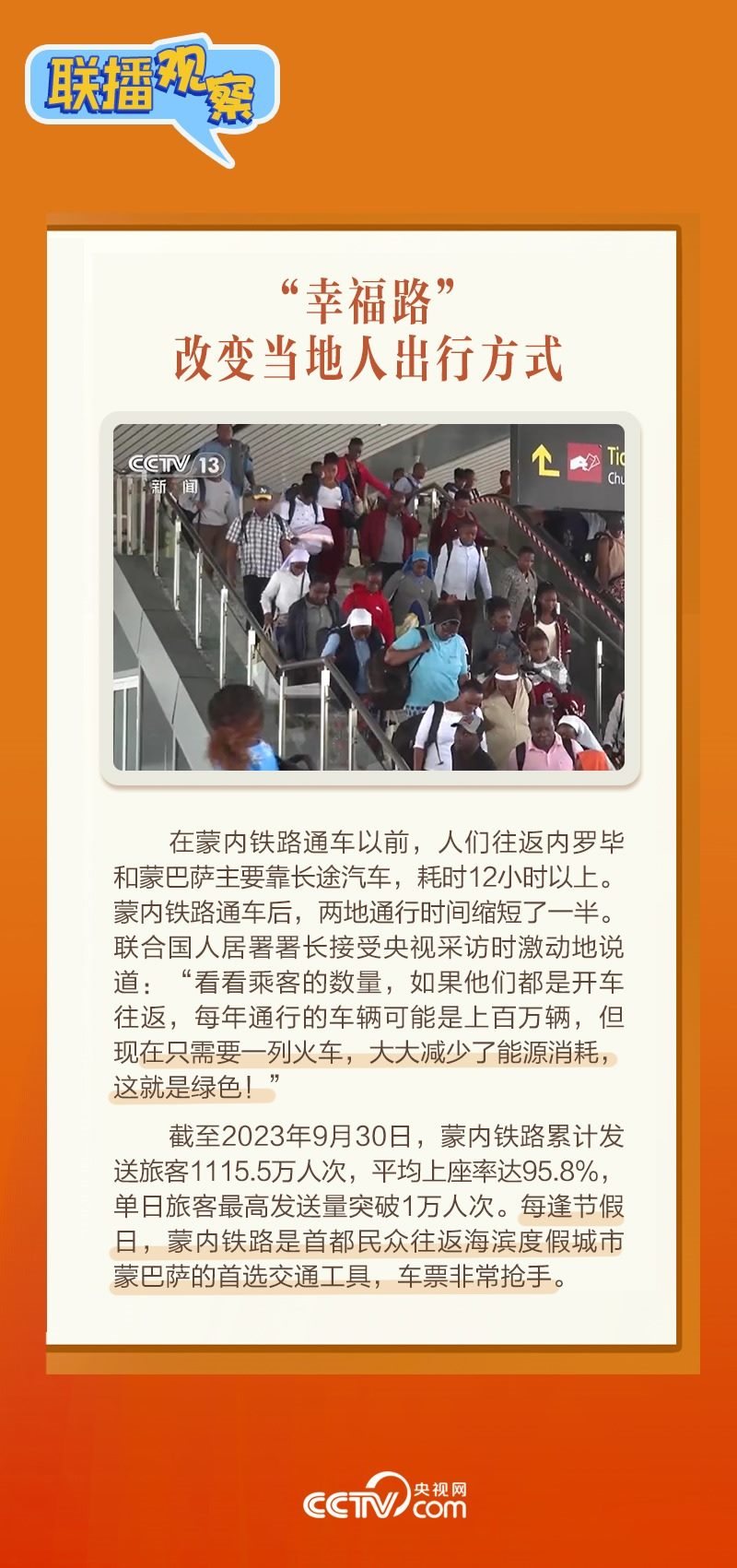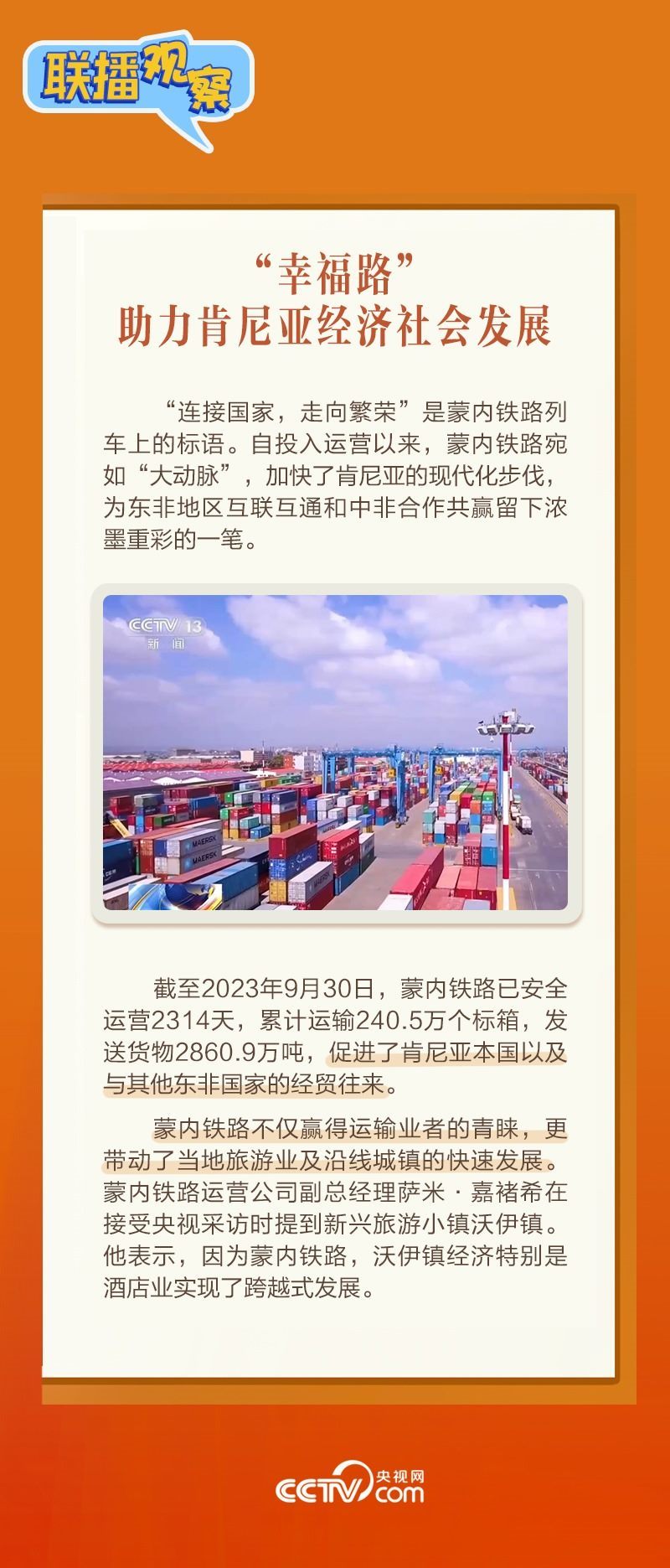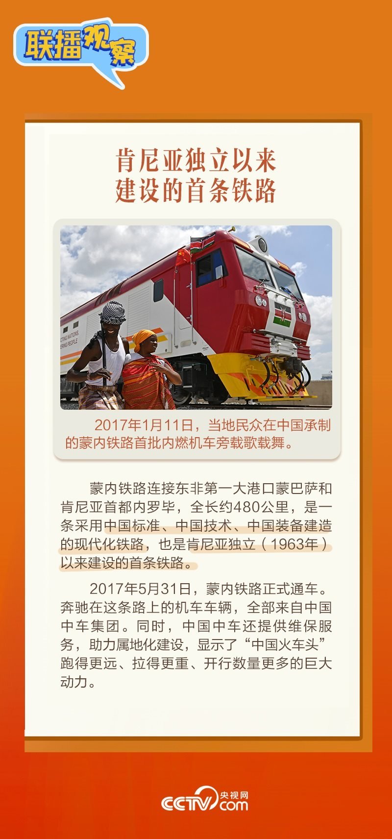 此前,習(xí)主席在外事活動中多次提及蒙內(nèi)鐵路,《新聞聯(lián)播》也持續(xù)關(guān)注這條路的建設(shè)及開通后的運營情況。這條“幸福路”有何特別之處,習(xí)主席為何頻頻提及?它的建成通車給當?shù)貛砟男┳兓??《?lián)播觀察》邀您一同了解。