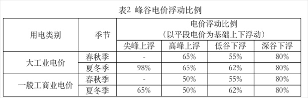 ?。ㄈ┱{(diào)整峰谷電價浮動比例,具體見表2。浮動比例以平段電價為基礎,平段電價包含上網(wǎng)電價、上網(wǎng)環(huán)節(jié)線損費用、系統(tǒng)運行費用、輸配電價(不含容(需)電價)、政府性基金及附加。