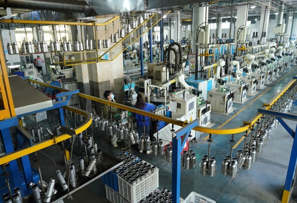 這是2023年12月21日在浙江省永康市一家保溫杯生產(chǎn)企業(yè)拍攝的自動(dòng)化生產(chǎn)流水線(xiàn)。新華社記者 韓傳號(hào) 攝
