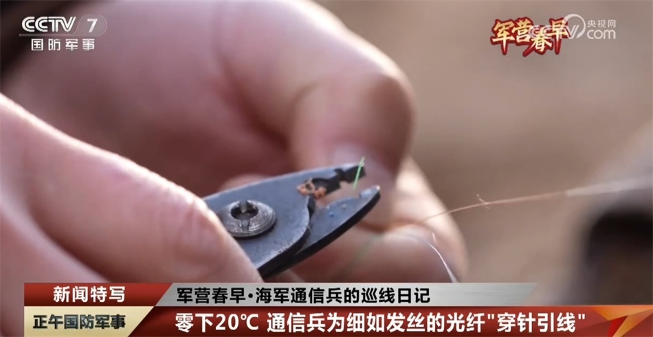 海軍某總站 鄭乾:因為光纖是玻璃材質(zhì)的,冬天特別寒冷,就會導(dǎo)致光纖特別容易斷裂,特別是在光纖切割刀切割光纖的時候,一不小心就會砸斷,有可能出現(xiàn)強行熔接的情況,一旦出現(xiàn)這種情況,任務(wù)就(可能)因為(數(shù)據(jù))無法使用,任務(wù)就會無法開展、失敗了。