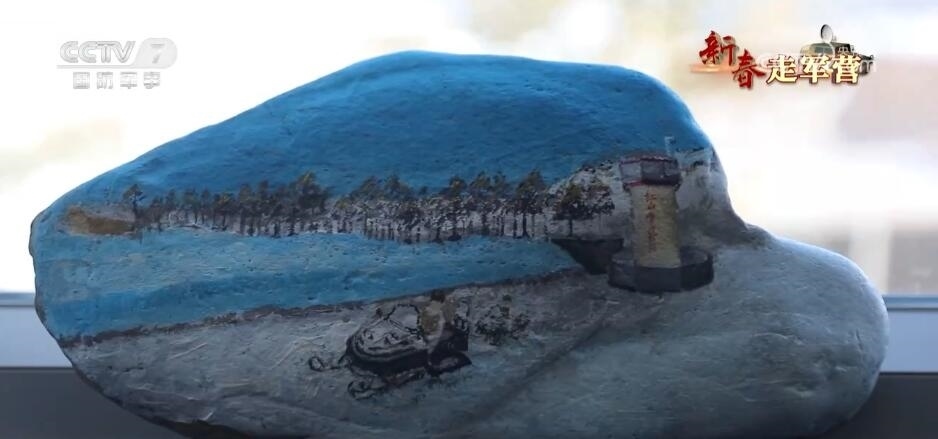 新疆軍區(qū)紅山嘴邊防連 段昱恒:我畫的這塊石頭,這里是我們紅山嘴邊防連的一個哨樓,這里是我們一起來的6名新兵,從哨樓出來準備去巡邏,前方有冰河,有雪山。在這里我還畫了一條龍,新的一年是龍年,我也希望大家龍馬精神,見龍皆是福。