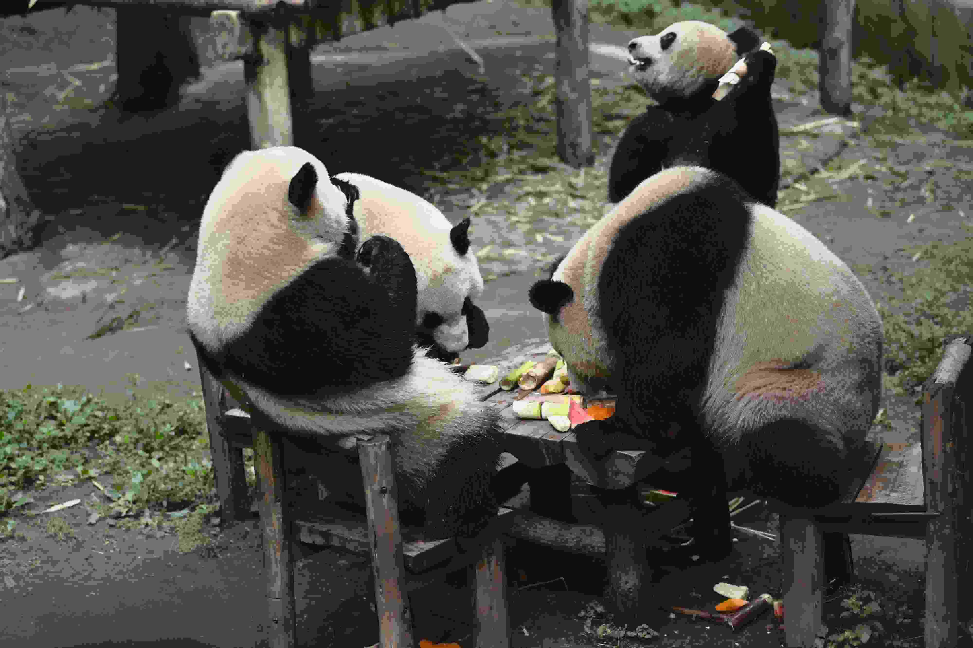 重慶:大熊貓圍桌共享大餐 5月21日,在重慶動物園內,大熊貓圍桌而坐,享用美食,......