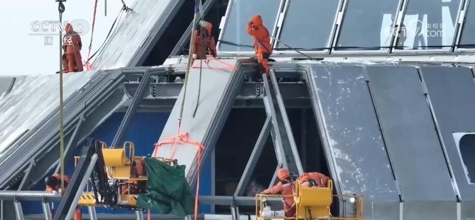 800多斤的幕墻板在大風(fēng)的作用下,就像飄在空中的樹(shù)葉,非常難以控制。此時(shí),現(xiàn)場(chǎng)的風(fēng)力已經(jīng)增加到了8級(jí),氣溫驟降。40分鐘之后,在現(xiàn)場(chǎng)所有隊(duì)員的配合下,第一塊板終于穩(wěn)穩(wěn)的就位了。緊接著是第二塊、第三塊。盡管已經(jīng)在風(fēng)雪中奮戰(zhàn)了十幾個(gè)小時(shí),但大家的臉上依然掛滿(mǎn)了微笑。凌晨12點(diǎn)半,最后一塊板終于順利安裝到位,新站迎風(fēng)面實(shí)現(xiàn)了全封閉,大家也終于放心了。