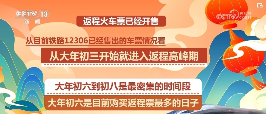 春節(jié)的返程火車票已經(jīng)開售,從目前鐵路12306已經(jīng)售出的車票情況看,從大年初三開始就進(jìn)入大家返程的高峰期,大年初六到初八是最密集的時間段,其中,大年初六是目前購買返程票最多的日子。