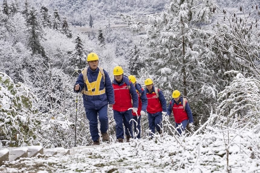 2月9日,在彭水縣中嶺山,國(guó)網(wǎng)重慶電力員工對(duì)電力線路開(kāi)展冰雪特巡。牟偉攝