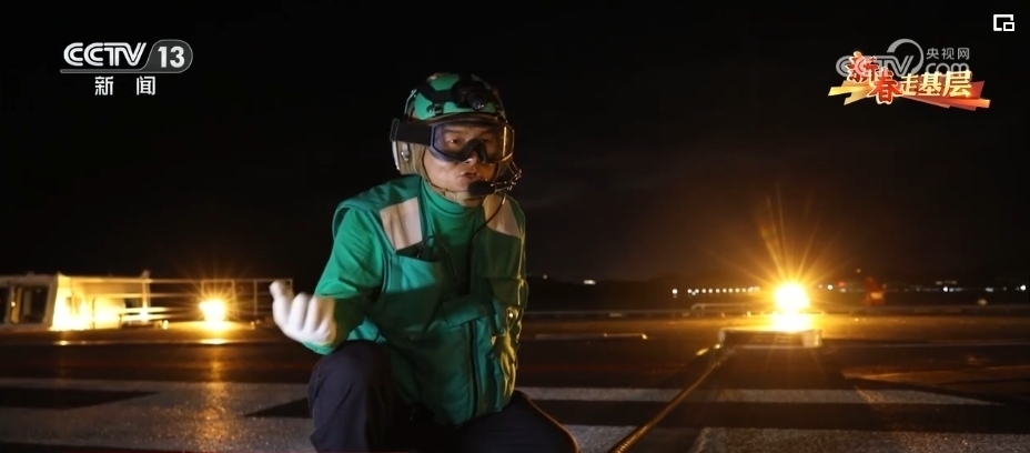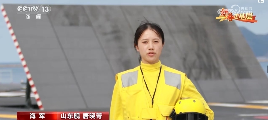 引導(dǎo)員唐曉菁的工作是負責(zé)引導(dǎo)艦載機就位、起飛。由于甲板上設(shè)備眾多,她的一舉一動都至關(guān)重要,戰(zhàn)機起飛時,她的戰(zhàn)位距離飛機發(fā)動機只有不到20米。