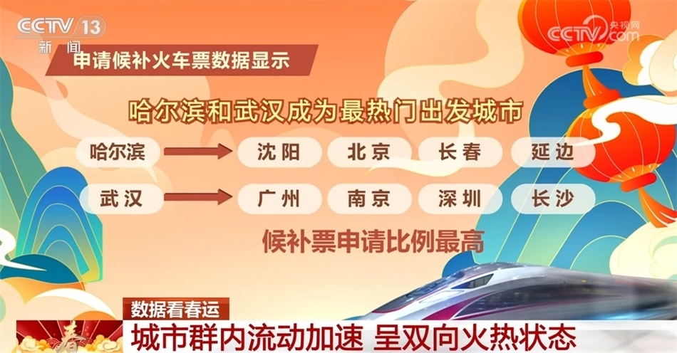 從申請(qǐng)候補(bǔ)火車(chē)票的熱門(mén)城市看,哈爾濱和武漢延續(xù)昨天的熱度,繼續(xù)成為今天候補(bǔ)票里最熱門(mén)的出發(fā)城市,從哈爾濱到沈陽(yáng)、北京、長(zhǎng)春、延邊,從武漢到廣州、南京、深圳、長(zhǎng)沙的候補(bǔ)票的申請(qǐng)比例最高。提醒有候補(bǔ)票需求的旅客,合理安排出行。