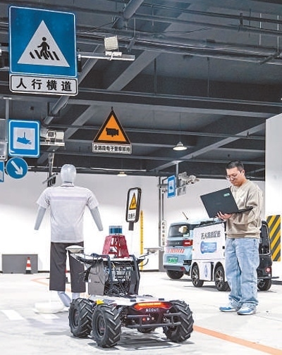 中國科學院雄安創(chuàng)新研究院內,科研人員在測試自動駕駛設備。