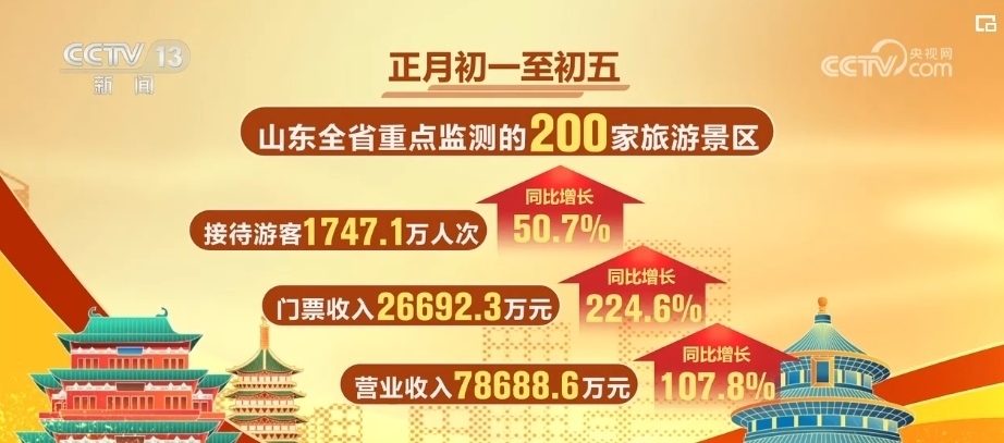 正月初一至初五,山東全省重點監(jiān)測的200家旅游景區(qū),累計接待游客超過1747萬人次,門票收入超2.6億元,營業(yè)收入超7.8億元,與上年同期相比,分別增長50.7%、224.6%、107.8%。