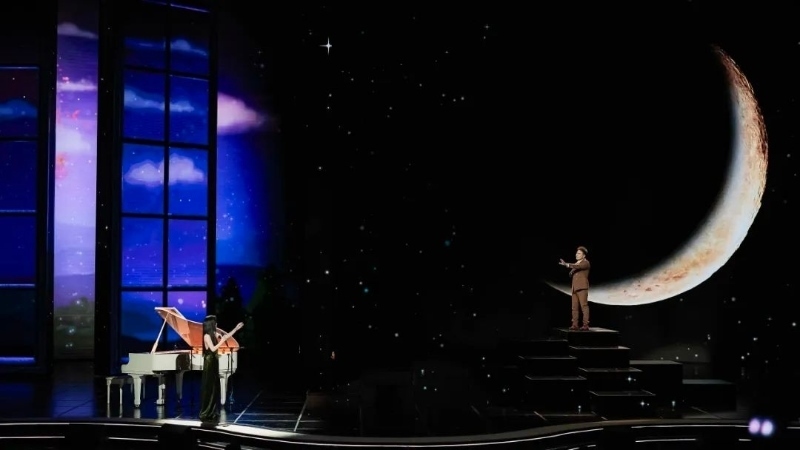 歌詞迅速修改到位,但舞臺(tái)的呈現(xiàn)成了讓人反復(fù)琢磨的問(wèn)題。如何表現(xiàn)“想見(jiàn)卻無(wú)法相見(jiàn)”的感覺(jué)?如何營(yíng)造恰到好處的絲絲愁緒?從初次彩排時(shí)用秋千承載思念,到二排時(shí)改用燈光打造“兩個(gè)空間”,幾番嘗試總讓人感覺(jué)“還差點(diǎn)兒味道”。最后臺(tái)長(zhǎng)提議,用“剪影”去暈染思念的情緒,可以考慮用蘇軾的“人有悲歡離合,月有陰晴圓缺”的意境,以月亮為背景。這一下子打開(kāi)了大家的思路。