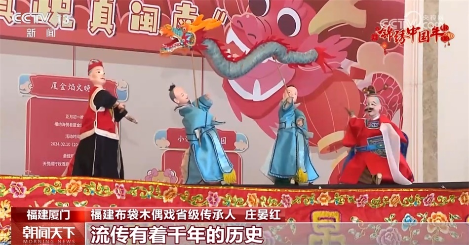 同樣在春節(jié)期間受到游客喜愛的還有廈門的非遺項目布袋木偶。莊晏紅是布袋木偶戲演出團隊的一員,她告訴我們,春節(jié)期間,團隊會有20多場的演出,忙得熱火朝天,在景區(qū)、酒店、藝術館為游客展示非遺魅力。