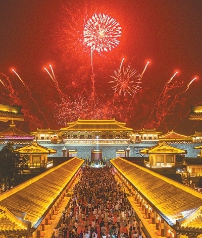 游客們在湖北省襄陽市唐城景區(qū)看煙花秀。當(dāng)?shù)嘏e辦的戲曲文化藝術(shù)節(jié)吸引了眾多省內(nèi)外游客前來,拉動(dòng)當(dāng)?shù)芈糜谓?jīng)濟(jì)。據(jù)統(tǒng)計(jì),2023年國內(nèi)出游人次達(dá)48.91億,國內(nèi)游客出游總花費(fèi)4.91萬億元。楊 東攝(影像中國)
