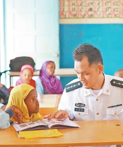 中國人民解放軍駐吉布提保障基地官兵與吉小學(xué)生交流。中國軍隊(duì)在吉布提建設(shè)保障基地,是中吉兩國政府經(jīng)過友好協(xié)商作出的決定,為中國軍隊(duì)執(zhí)行護(hù)航、維和任務(wù)等提供有力保障。30多年來,我國已派出維和人員5萬余人次,赴20多個(gè)國家和地區(qū)參加聯(lián)合國維和行動(dòng)。王宗洋攝(影像中國)