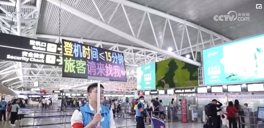 還有15分鐘登機,這在平時不算晚。可在初八的出港高峰里,如果沒有志愿者的及時指引,旅客就很有可能錯過飛機。