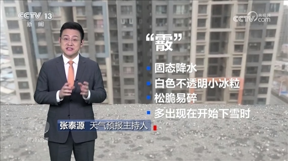 天氣預(yù)報主持人張?zhí)┰矗骸啊薄且环N固態(tài)降水,由白色不透明的小冰粒組成,近似球形,有時呈圓錐形,有雪狀結(jié)構(gòu),通常在地面氣溫不太冷時降落,在剛開始下雪的時候出現(xiàn)?!?/p>