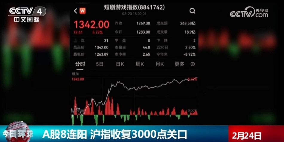 2月23日A股再度發(fā)力,上證指數(shù)收報3004.88點,漲幅0.55%;深證成指收漲0.28%。滬指“八連陽”收復了3000點整數(shù)關(guān)口。?