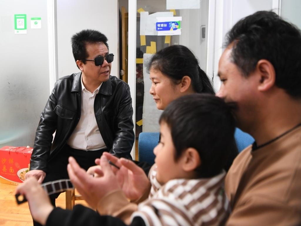 王永澄(右一)在福州市海峽盲人按摩指導(dǎo)中心為盲人朋友傳授盲按要領(lǐng)(2月6日攝)。
