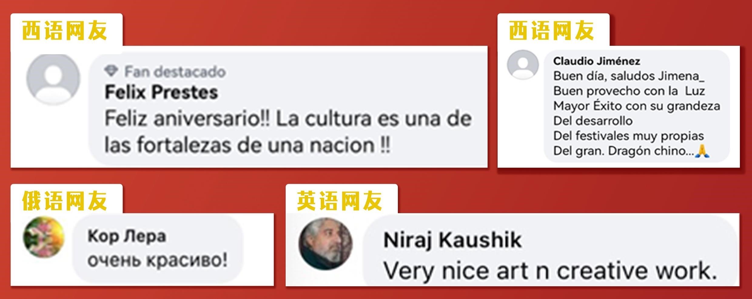 文明魅力無國界,中國文化受海外網(wǎng)友追捧。《彩云追月》《小雅·鹿鳴》《蒲公英的天空》等節(jié)目讓海外受眾領(lǐng)略了元宵晚會(huì)蘊(yùn)含的文化底蘊(yùn)。眾多海外網(wǎng)友紛紛留言表達(dá)了對(duì)中華文化和中國節(jié)日的喜愛。西語網(wǎng)友Claudio Jiménez留言:“中國擁有這么多自己的節(jié)日,好棒”。西語網(wǎng)友Felix Prestes說:“文化是一個(gè)國家的基石,祝你們節(jié)日快樂!”英語網(wǎng)友Niraj Kaushik和Cham Gurung評(píng)論說:“很美且很有創(chuàng)意的作品”“節(jié)目令人印象深刻,我很喜歡”。