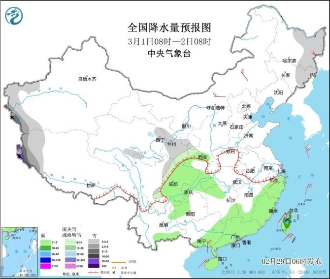 央視網(wǎng)消息:中央氣象臺網(wǎng)站2月29日消息,過去一天,全國雨雪逐漸發(fā)展增強,北方大部以降雪為主,集中在西北地區(qū)東部、內(nèi)蒙古、山西、山東和東北三省等地;南方地區(qū)雨水范圍明顯擴大,江蘇、上海、浙江、安徽南部、江西中北部、湖南中南部、廣西北部等地部分地區(qū)出現(xiàn)中到大雨,今天凌晨起,蘇皖北部出現(xiàn)雨轉(zhuǎn)雪,江蘇連云港、宿遷、徐州等地雪花紛飛,并伴隨低溫和大風(fēng)天氣,體感十分寒冷。