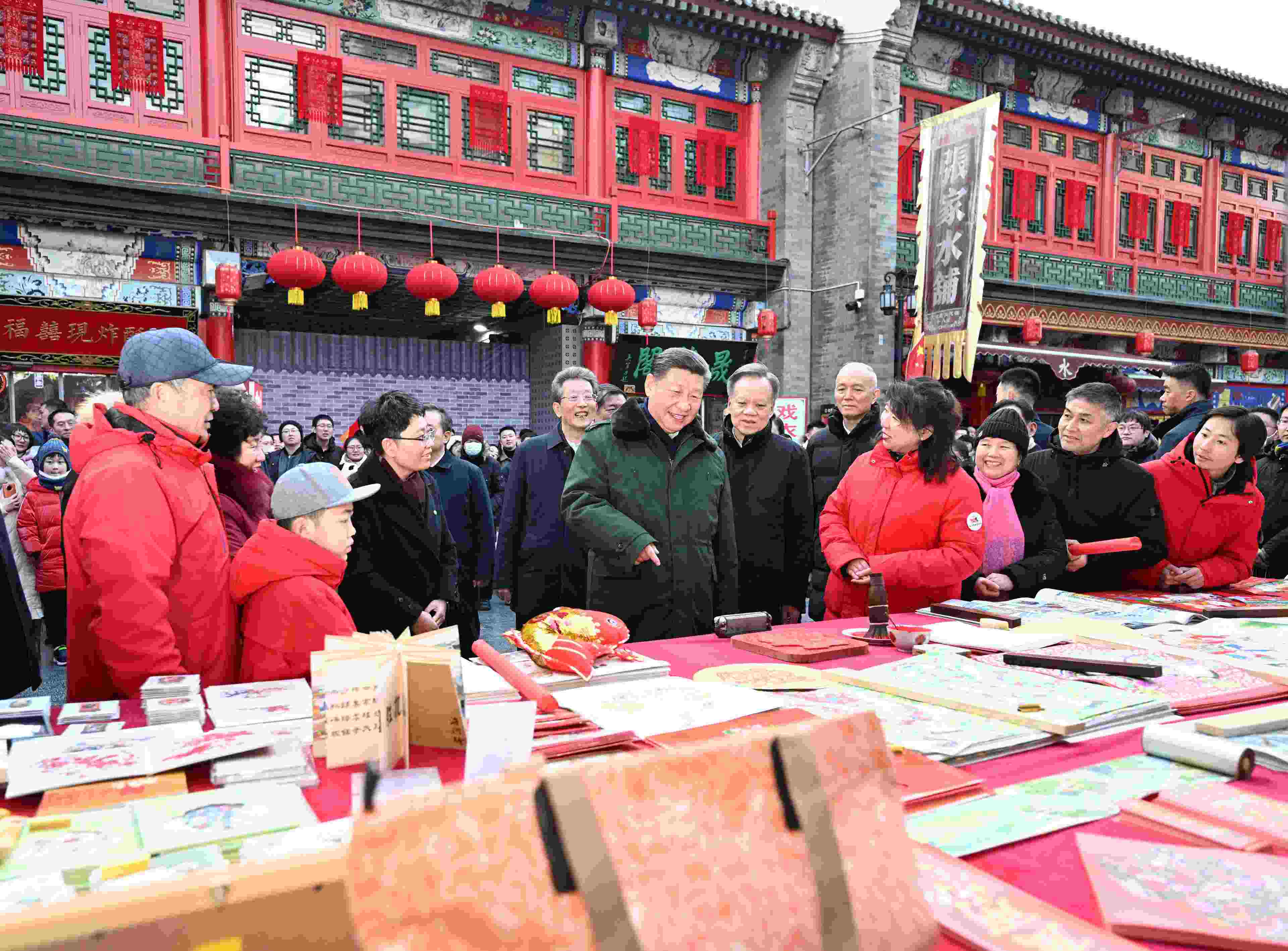 △ 2024年2月1日,習(xí)近平總書記在天津古文化街考察時(shí),同店鋪員工和現(xiàn)場群眾互動(dòng)交流。