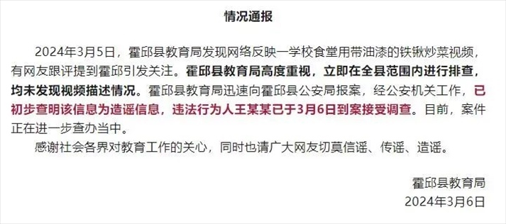 ·安徽霍邱縣教育局辟謠“學(xué)校食堂用帶油漆的鐵鍬炒菜”:造謠者已到案。