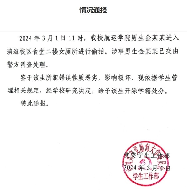 ·渤海大學(xué)一男生進入食堂女廁偷拍,被開除學(xué)籍。